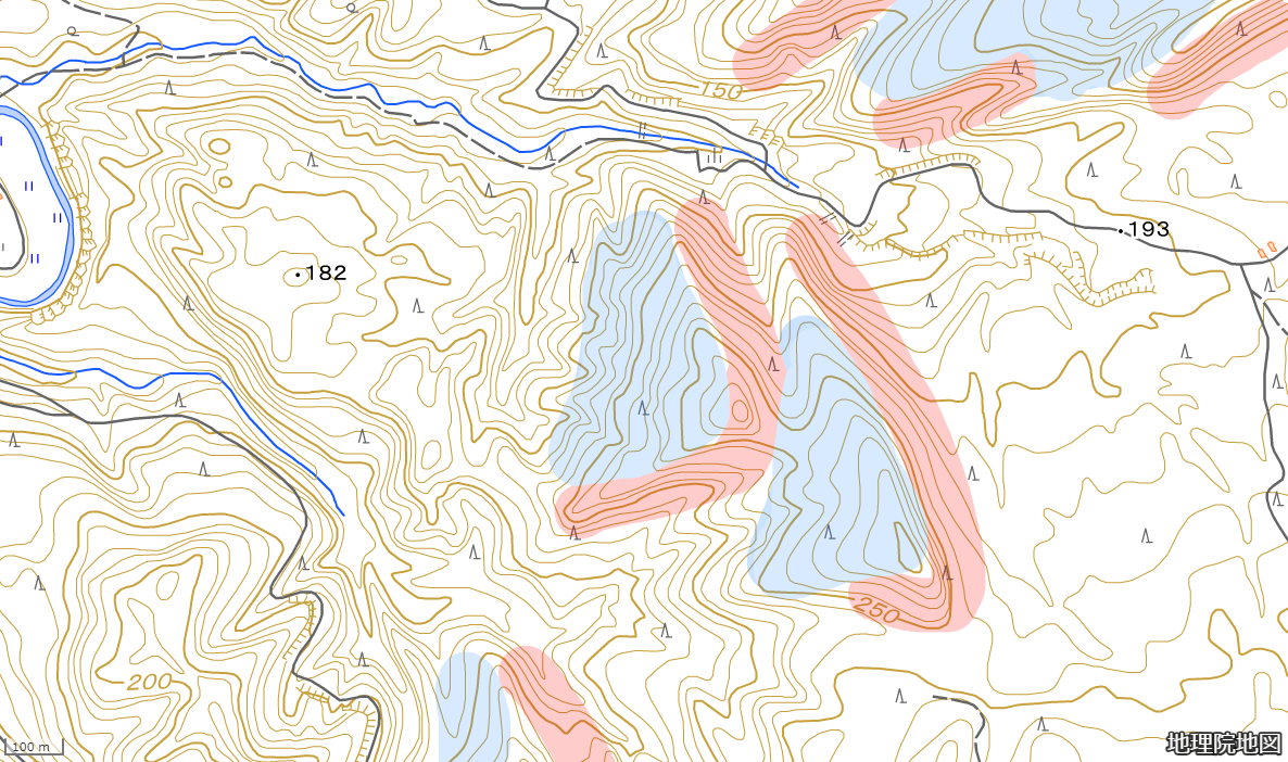 標高分布から傾斜を考えると、少し不明瞭ですが、次の図のように傾斜がきつい部分と緩やかな部分にある程度分かれると分かります。高い側から明確な尾根が伸びていないこと、谷の両側の傾斜がかなり違うことから着想を得られるとこっちのものです。