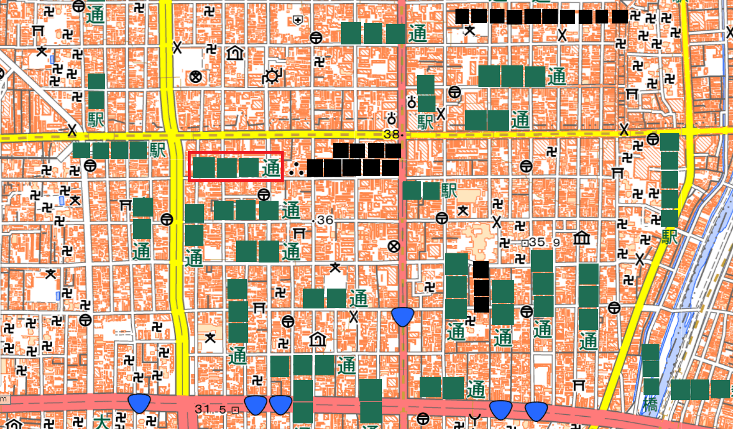 (2) 画像中央付近の通り (赤枠) の名前を漢字で答えてください。