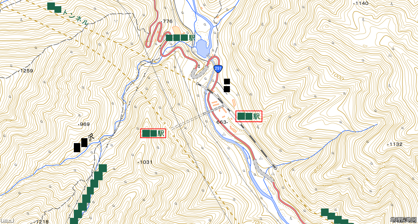 画像中央付近の赤枠で囲まれた駅の名前を漢字で解答してください。なお、赤枠で囲まれた2つの駅は同じ名前です。