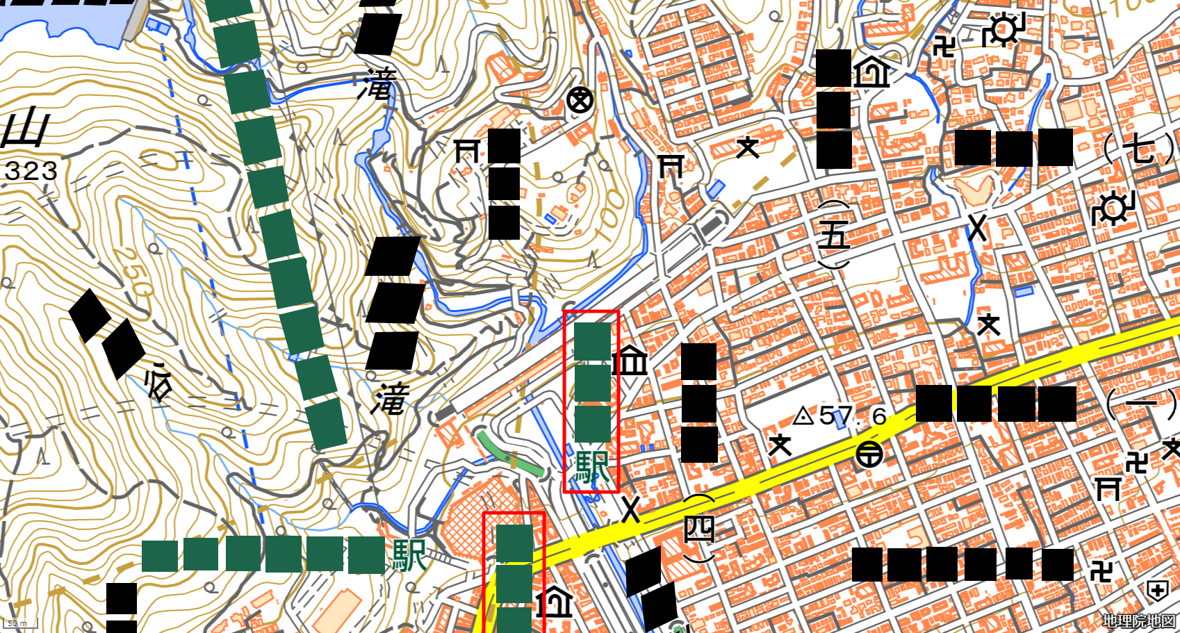 画像中央付近にある駅の名前 (赤枠2箇所) を漢字で解答してください。赤枠で囲まれた2つの駅は同じ名前です。