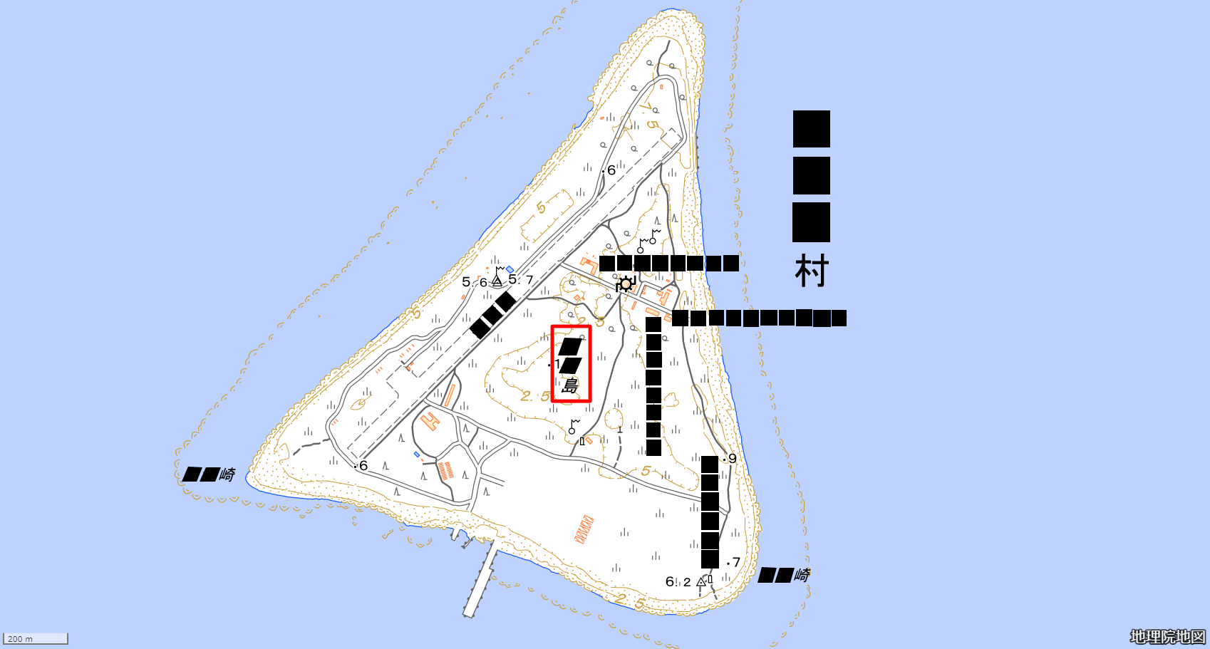 画像中央の島の名前 (赤枠) を漢字で答えてください。