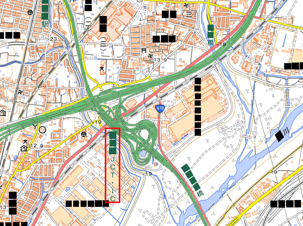 画像中央にあるジャンクションの名前 (赤枠)を答えてください。「JCT・IC」は不要です。