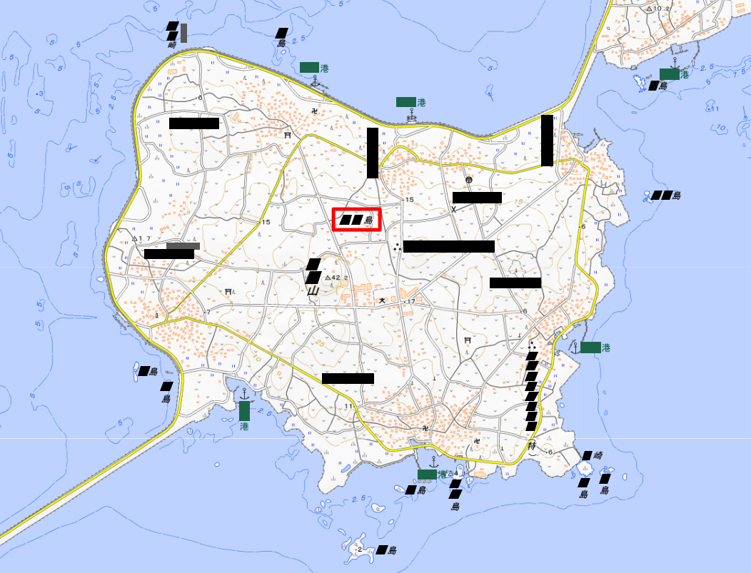 画像中央にある島の名前 (赤枠) を漢字で答えてください。