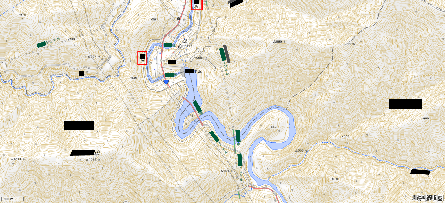 画像中央付近を流れる河川の名前 (赤枠) を漢字で答えてください。