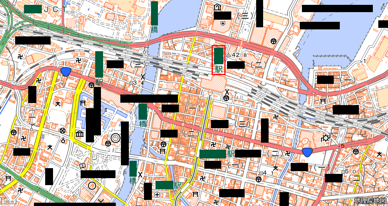画像中央にある駅の名前 (赤枠)を漢字で答えてください。