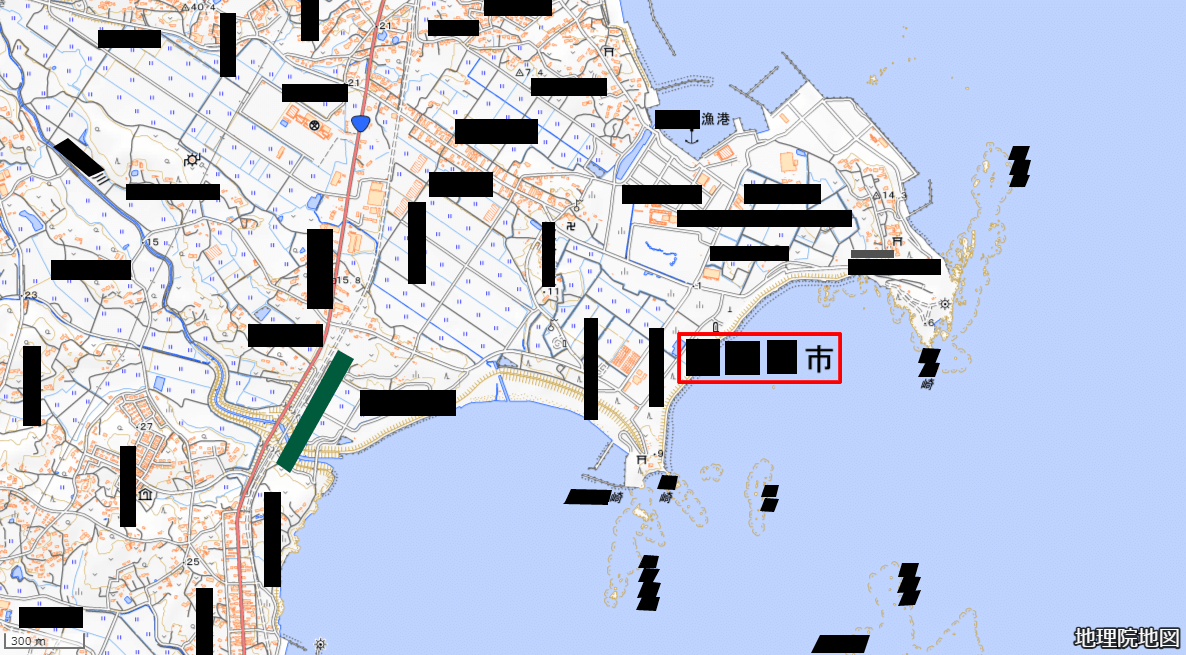 画像中央の場所を含む市名 (赤枠) を答えてください。